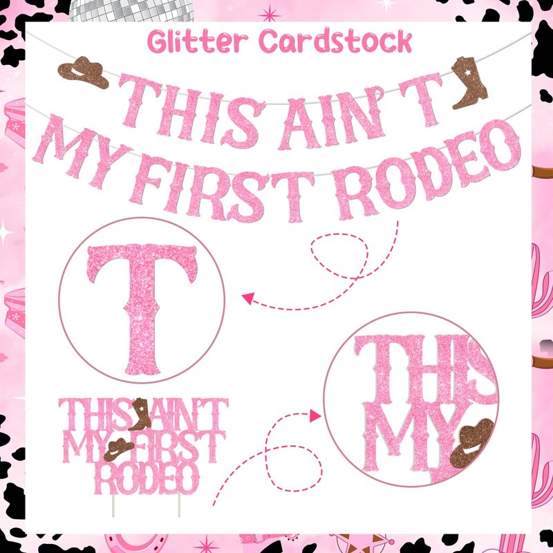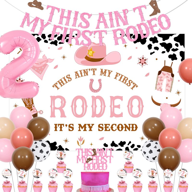 Package Includes: 1pc This Ain’t My First Rodeo backdrop 1pc This Ain’t My First Rodeo banner 1pc This Ain’t My First Rodeo cake topper 12pcs cowgirl 2nd birthday cupcake toppers 20pcs matte latex balloons 12” 1pc number 2 foil balloon 2pcs white ribbons