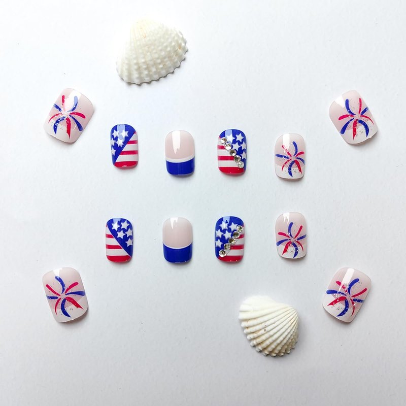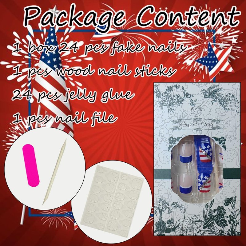 - French Tip Nails Kit : 24 PCS ,12 different sizes of independence day short press on nails , 24 * jelly glue, 1 * nail file, 1 * wooden stick. Help you wear these patriotic 4th of July fake nails better. A full range of tools meet all your wearing needs. It can be worn repeatedly so that you can replace it at any time, and it can better protect your nails.