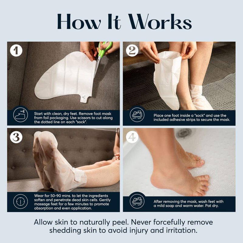 - THE TLC YOUR FEET DESERVES: 1) Place your feet inside the “socks” and secure with the adhesive strips. 2) Relax for 50-90 minutes while the foot peel formula deeply penetrates your skin. 3) Remove socks and massage the rest of the foot serum evenly. Wash and dry feet.