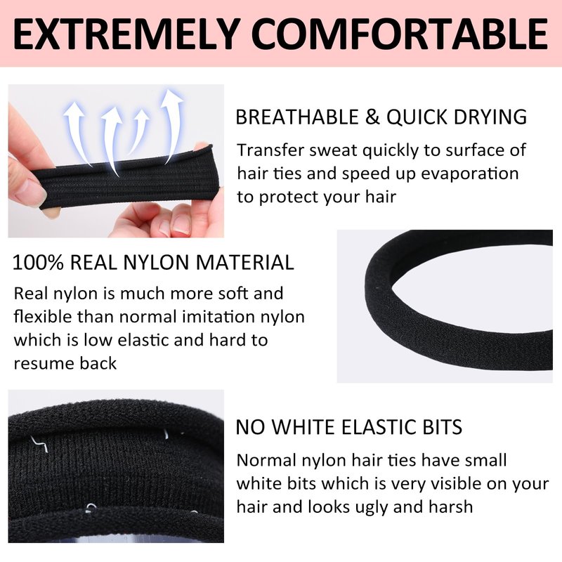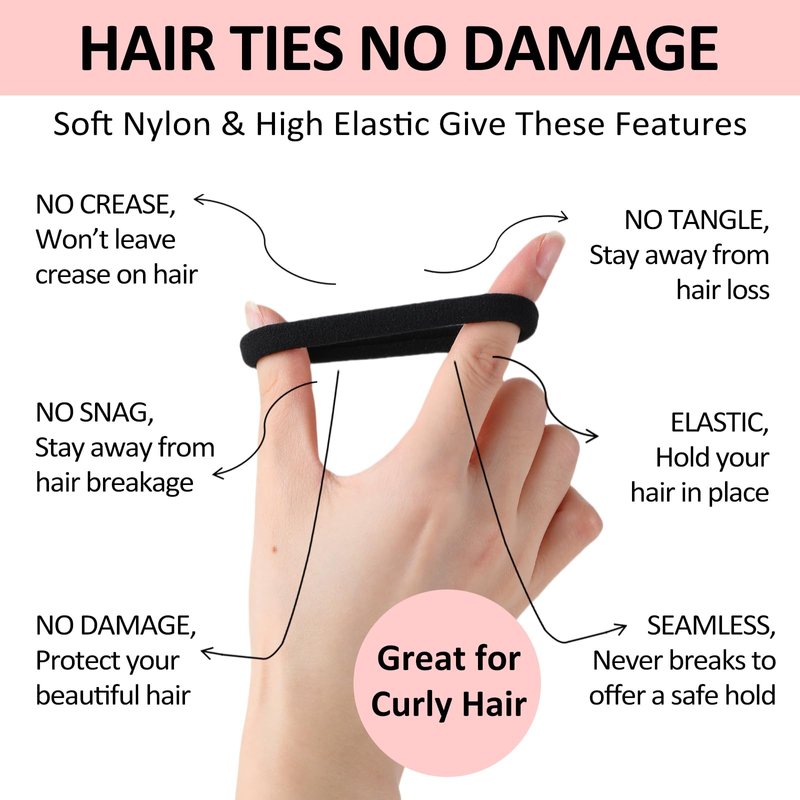 - SOFT HAIR TIES FOR CURLY HAIR : Black hair ties no damage are made of 100% real nylon not as normal imitation nylon hair ties bulk without elasticity. Soft ponytail holders for thick hair are more softer than cotton hair ties for women to get curly hair ties for thick hair no damage. Ouchless hair elastics black are creaseless and no dent, to make elastic hair band great no pull hair ties curly hair, curly hair elastic bands, curly hair ponytail holder & elastic hair bands for thick hair no crease