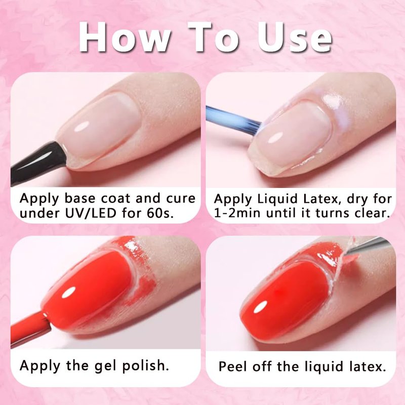 - 【Super Easy Application】 First, apply the nail protector from nail polish with a thick layer so that it can be peeled off easily. Second, peel off the liquid latex after curing your gel nail polish. Last, Please kindly be noted that the latex tape plays a role of basic protection. It would be better not to accumulate too much gel nail polish on the latex tape during use for easy peeling.