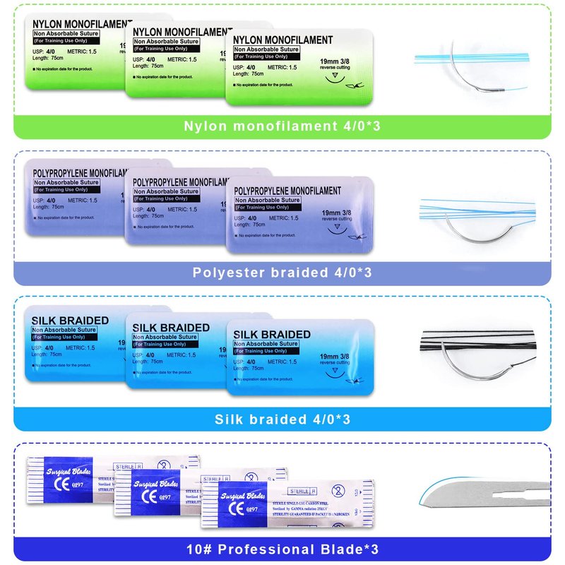- 【Suture Practice Kits】The kit includes authentic human skin-like suture pad (with 17 pre-cut wounds), surgical training scissors, 2 forceps (1 tweezers with teeth and 1 without teeth), needle holder, mosquito forceps, 3# scalpel handle, 10# blades, 3 types of main non-absorbable sterile sutures (nylon and polypropylene monofilament, silk thread)