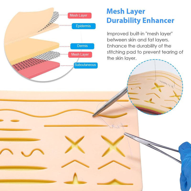 - 【Durability】The 3-layer suture pad is reusable. A protective mesh is placed on the surface of the skin to prevent the suture pad from breaking, which is especially suitable for beginners in suture training.