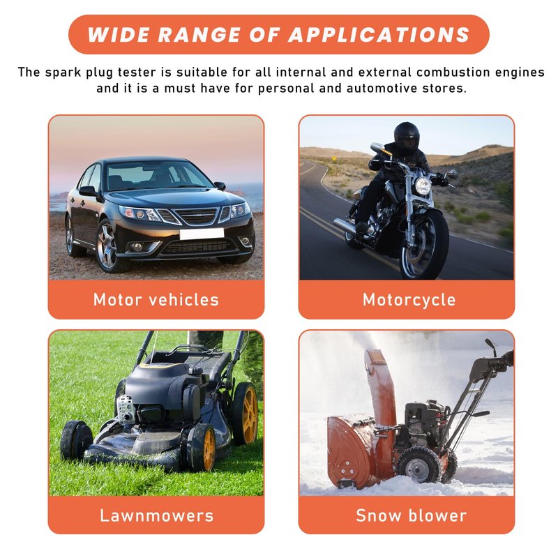 - 【Wide Applied】: The inline spark plug tester is suitable for all internal and external combustion engines and is an essential diagnostic tool for engines. It is widely used in cars, trucks, motorcycles, lawn mowers, snow blowers, trimmers, generators and more. It is a must-have for personal and auto stores.