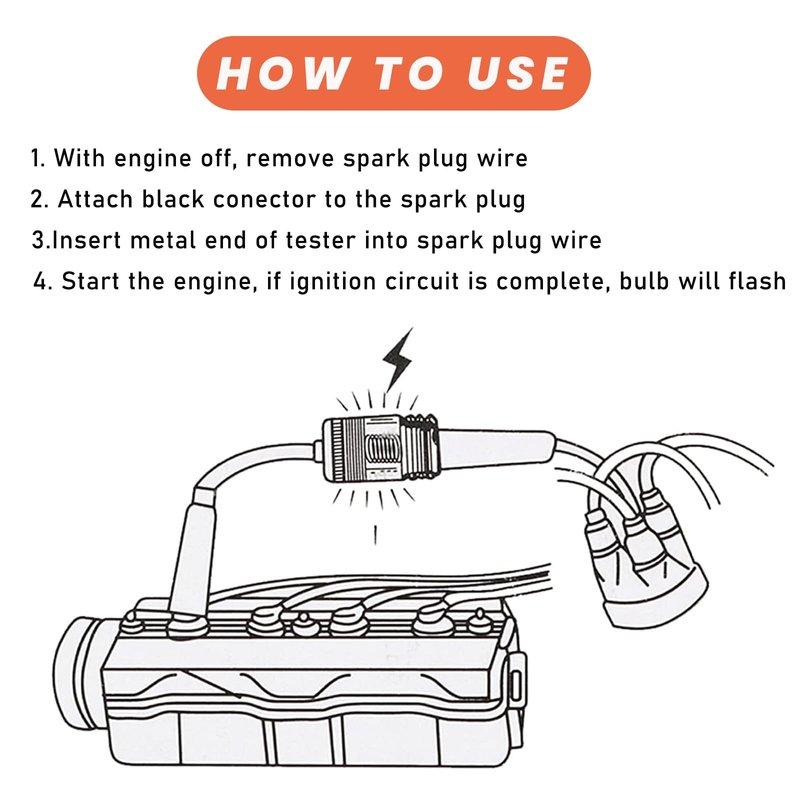 - 【Testing Method】: On first, remove the spark plug wires with the engine off. Next, connect the black connector to the spark plug. And lastly, plug the metal end of the tester into the spark plug wire. When the engine starts, the indicator light will flash if the ignition circuit is on.