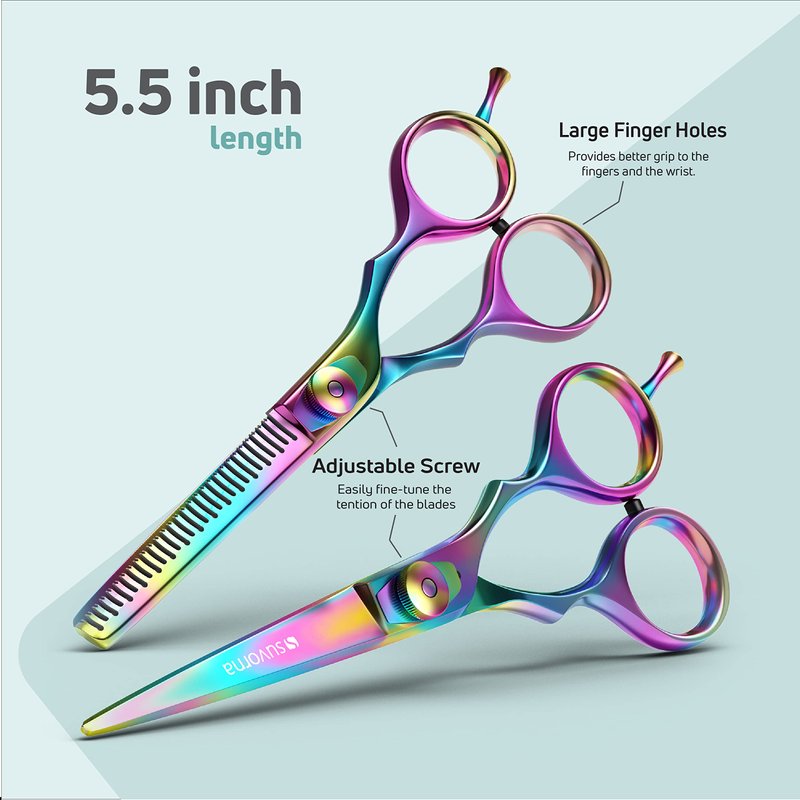 - 💎 RAZOR SHARP HAIR SHEARS SET: Suvorna's 5.5" perfect size design reduces strain on your elbows and wrists, letting you cut for longer without discomfort. Our razor-sharp, convex blades glide effortlessly through hair, eliminating hair bending and pushing. Tension adjustment helps cut at your ease & large finger holes with rubber inserts suitable for both small and big hands. The hollow ground blades ensure clean snips, increasing cutting efficiency and facilitating precision cuts.