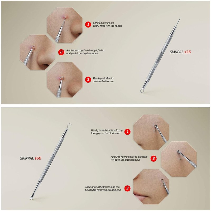 You will appreciate the versatility of this Skinpal S100 Set as it will provide for all your blackhead, whitehead, milia, pimples and general comedone extractor needs. Well designed extractors to remove dirt, dead skin cells and sebum from skin pores.
