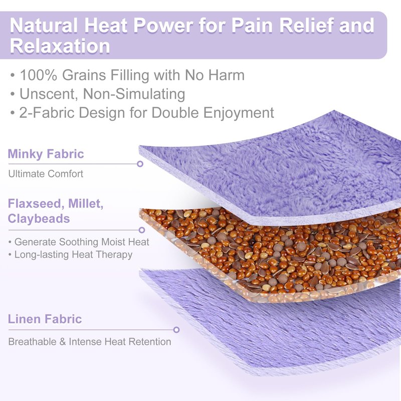 - Heating Pad Microwavable with Natural Therapy: Thanks to the miraculous co-working of the flaxseed, millets and clay beads, our heat pack microwavable efficiently relieves joints pain, cramps, tight muscles, swelling, knee pain, and inflammation by delivering soothing, penetrating heat to targeted areas.