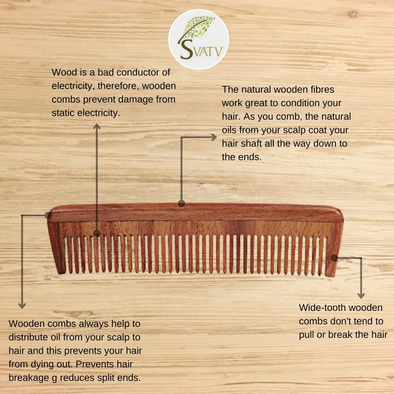 SVATV HERBAL ROSEWOOD COMBS Hair has always been an invaluable asset for the people of India, decking of flowers, pearls, and gold on it has been inseparable from Women. The use of shikakai, soap-nut, hibiscus, jasmine, coconut oil is practised even today, Ayurveda has played a significant role in hair conditioning. When it comes to the grooming of hair wooden combs have always done wonders. Right from the invention of Neem wood-based thin tooth combs for getting rid of the ticks and lice in the hair to Sheesham wood-based designer combs for the queens and emperors, the contributions of the wooden comb artisans are enormous. High-Quality Sheesham wood combHandcrafted in India Free from the static charge, unlike plastic Made for durability, this wooden hair comb is the perfect tool for everyday use. There's a comb for everyone that will meet the styling needs for all. Perfect for wet hair. Great for damage doers & strength seekers alike. For women with wavy, frizz-prone hair looking to defy humidity for a smooth & sleek end look. Round Handle Comb is designed to provide precise trimming and smooth, drag-free combing and offers you the control necessary for superior hair care. With comfortable hand-grip and wide-spaced teeth detangle.