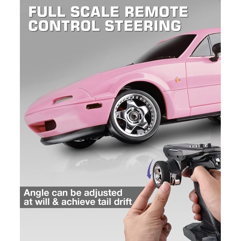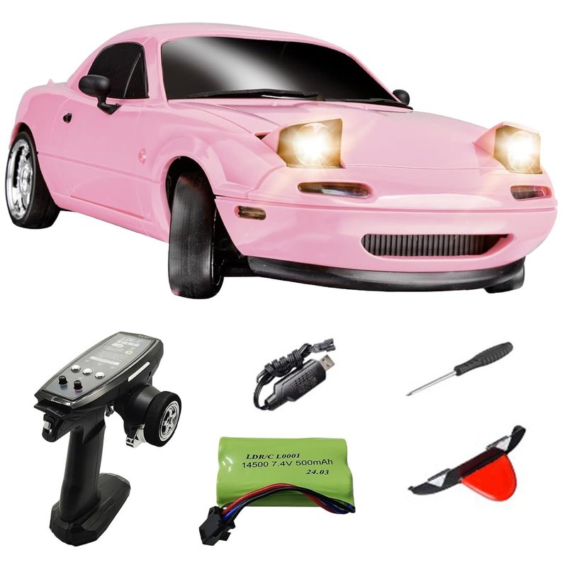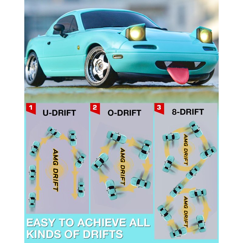 - 🔥Unique Model RC Car: The shape of Mazda Miata MX5 is cute and droll, when the jump light is turned on, with the grille and appearance, it looks like a big happy eye. The extra tongue part adds more atmosphere and funs during your racing.