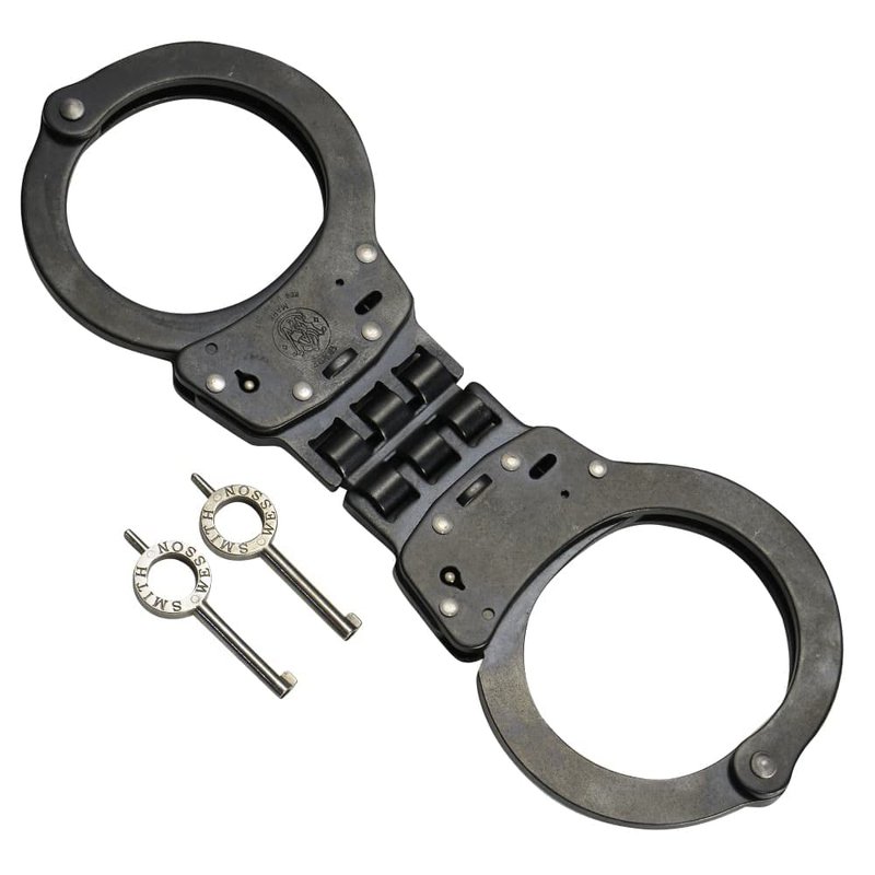 Hinged design in a blue gray color further restricts movements for specialty applications. Folds flat to fit most standard pouches uses a standard key and features double lock slot configuration. Available in both nickel and blue. Weight: 11 ounces. Has double lock slot configuration for increased security. The term “blue” when referring to the finish/color of a steel item is a description for the finish of the product. The process being described is called blueing which produces a deep blue color Push pin available.ATTRIBUTES Color: Blue Finish: Blued Lock Style: Two Sided Material: Carbon Steel Special Features: Comes With Two Keys Style: Hinged