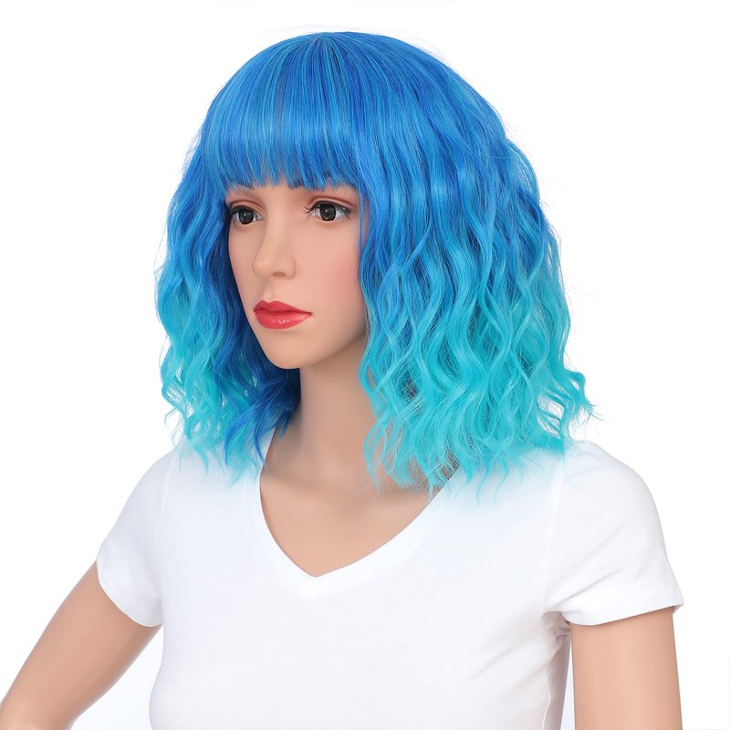 SWACC 12 Inch Short Curly Wavy Bob Wig with Bangs Synthetic Hair Wig for Women with Wig Cap (Teal Blue Ombre)
