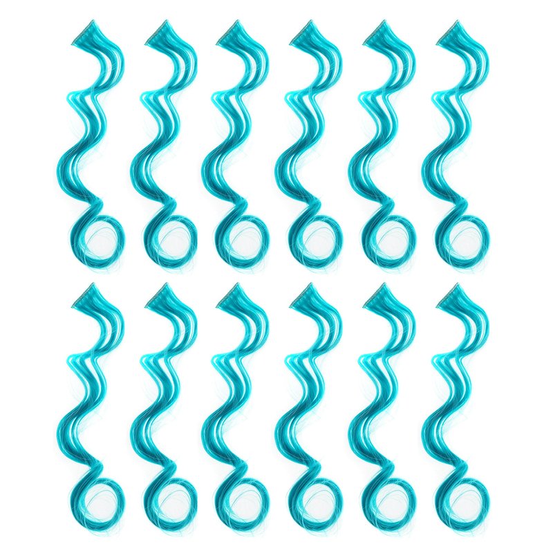 SWACC 12 Pcs Curly Wavy One Color Party Highlights Clip on in Hair Extensions Colored Hair Streak Synthetic Hairpieces (Teal Blue)