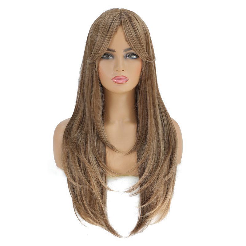 SWACC Long Layered Straight Wig with Bangs Synthetic Hair Wig for Women with Wig Cap (Brown Blond Highlight)