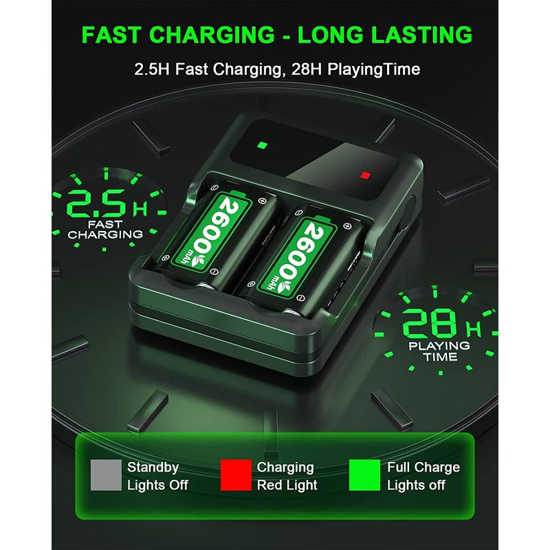 - [Large Capacity - Fast Charging]: SWANPOW for xbox controller battery pack is equipped with two 2600mAh super-capacity rechargeable batteries and chargers, which can be fully charged within 2.5 hours, and the running time of up to 30 hours after full charge, xbox rechargeable battery is durable and has a lifespan of 2000+ times.