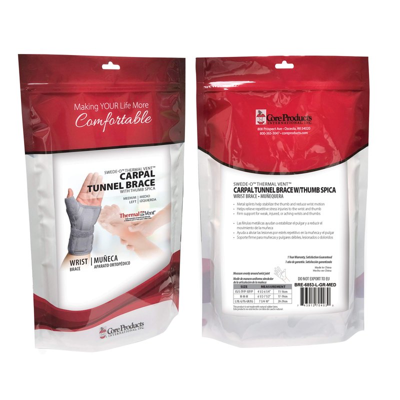 The Swede-O Thermal Vent Carpal Tunnel Brace with Thumb Spica provides comfortable support and compression to help relieve pain and discomfort associated with carpal tunnel syndrome, RSI, skiers thumb, and other wrist and thumb related injuries. This product has a removable 6 inch palmar support and a removable 7 inch contoured aluminum thumb splint to help restrict wrist and thumb motions that may aggravate nerves, tendons, or ligaments. The adjustable thumb closure ensures desired thumb positioning and the adjustable wrist closures provide a custom fit. This product contours to the natural shape of the wrist and thumb for increased comfort and support. Specify left or right hand when ordering. Thermal Vent is engineered with MVT2. Thermal Vent Supports are a valuable aid to help rehabilitate injured tissue. These products provide warmth and heat therapy to help increase pliability and elasticity of muscles and tendons making them more responsive to therapy and exercise. The layered thermal lining features a soft, nylon material that wicks away moisture and a micro-ventilated, breathable membrane that captures and retains your natural body heat to ease pain. This allows moist air to escape keeping the skin comfortable. With unsurpassed quality, these supports provide gentle compression and warmth to help reduce swelling and associated pain as well as promote recovery.