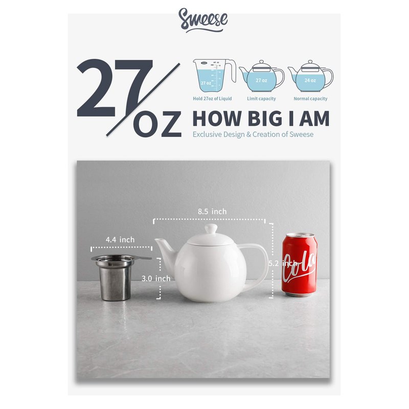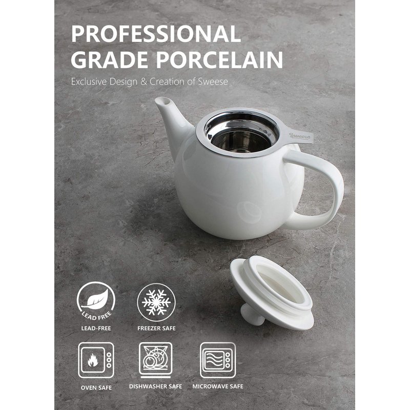 Sweese Teapots for Tea, 27 oz Porcelain Tea pot with Removable Stainless Steel Infuser, Tea Pots for Loose Tea - White, 221.101