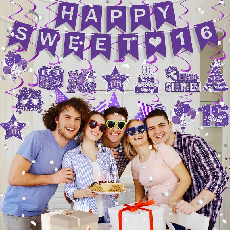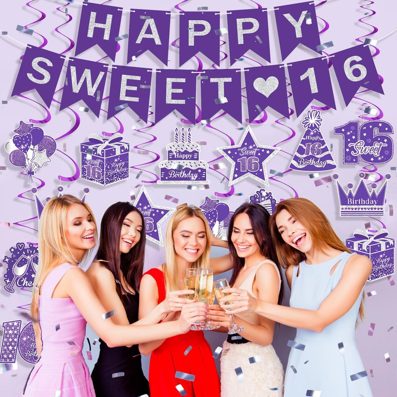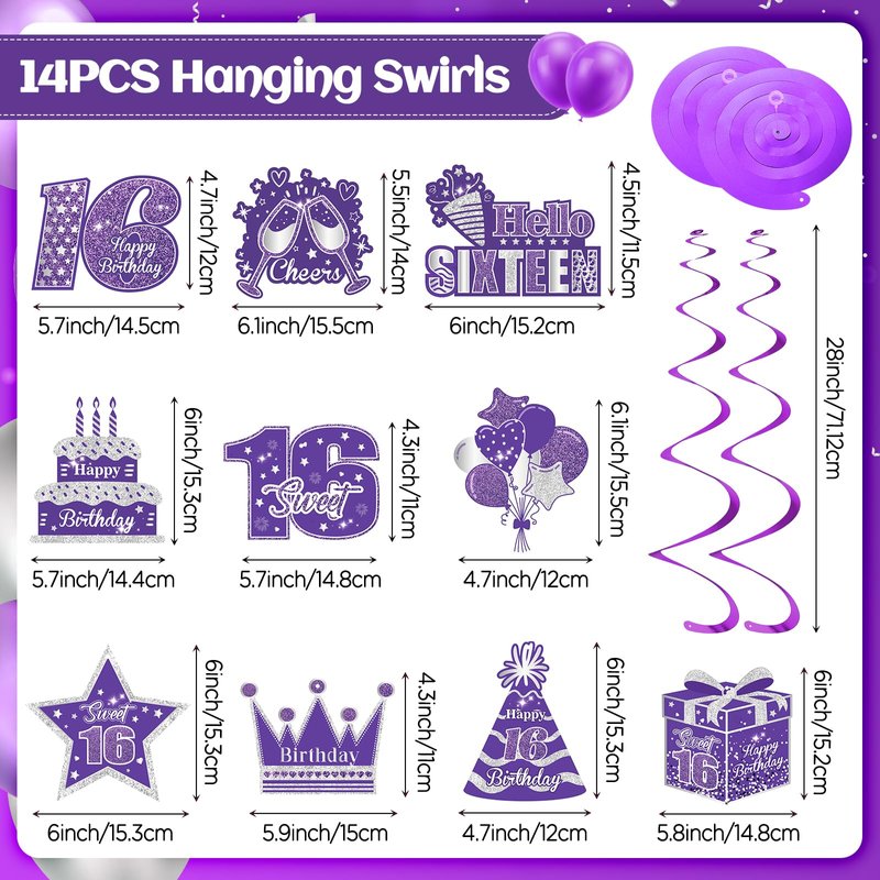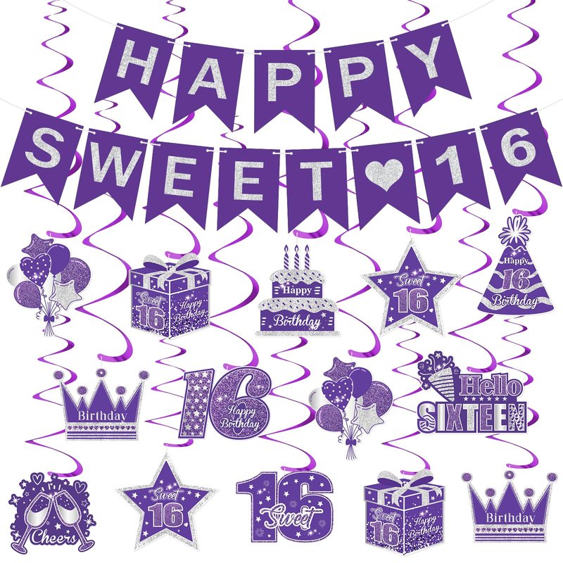 - 💜【Quality Material】The purple sweet 16 party decorations banner and happy 16th birthday hanging swirls are made of quality metallic foil and cardstocks, with clear printing, lightweight, portable and you can use for a long time
