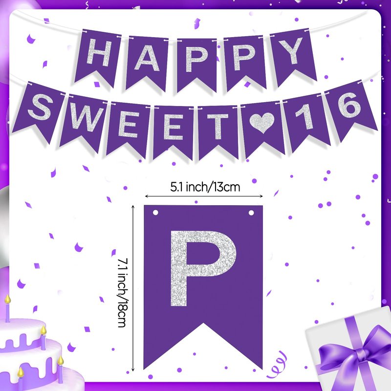 - 💜【Easy to DIY】In order for you to receive our purple silver 16th party decorations kit is intact, our purple silver happy sweet 16 banner and 16th birthday hanging swirls are required to be assembled, you can assemble them with your family and hang them anywhere you want to decorate