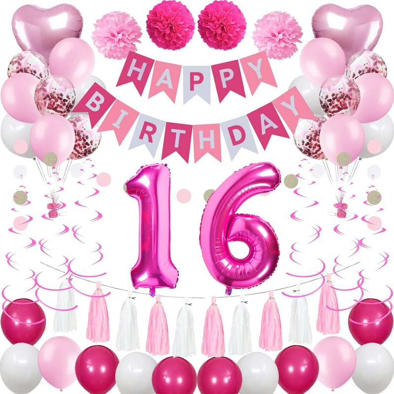 - ►54PCS BIRTHDAY DECORATION KIT◄: This sweet 16th happy birthday decor includes ‘HAPPY BIRTHDAY’ banner*1, number 16 foil balloons*2, hanging swirls*6, circle dots garland*1 set, tissue paper tassel (white*5, pink*5), latex balloons (white*8, pink*8, deep pink*6, rose gold confetti*6), pink heart foil balloons*2, paper pompoms (pink*2, deep pink*2), this pink white theme ornaments will meet all your needs.