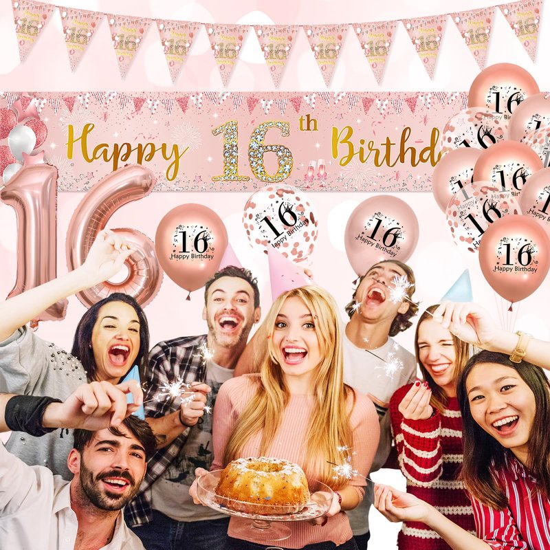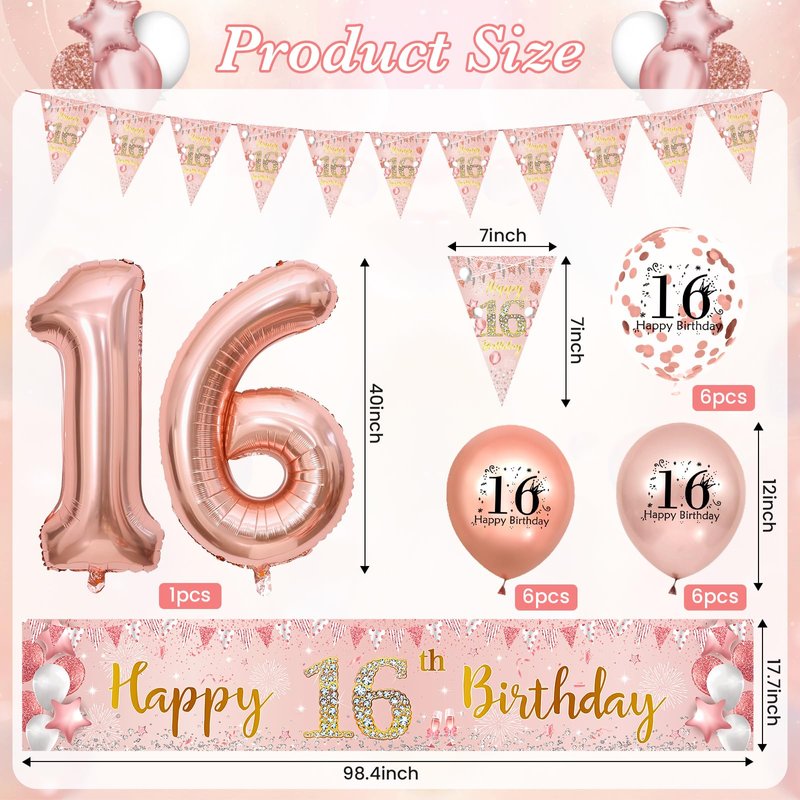 - 🍭Rose Gold 16th Birthday Decorations: There is 1pcs happy 16th birthday rose gold banner and 18pcs happy 16th birthday balloons with "16 happy birthday" patterns(6pcs metal rose gold birthday balloons and 6pcs balloons with rose gold sequins and 6pcs mette rose gold birthday balloons ) and a string 16th triangle flag and 1pcs 16 number foil balloon.With these so many rose gold birthday decor, they further set off a atmosphere of 16th birthday party.