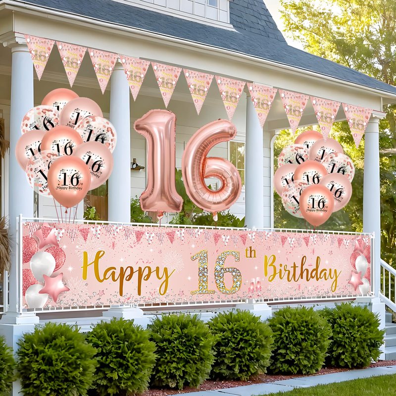 - 🍭Wide Application: You can use our rose gold 16th birthday set in many places. You can hang them on the fences, and hang in front of gate, and decorate your house outdoor. And the banner can use as a birthday photography background, you can take photos with your family.And spend your beautiful 16th birthday with your family.