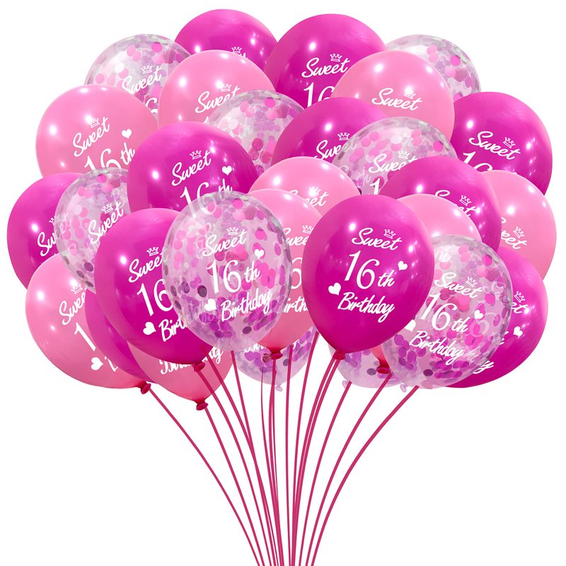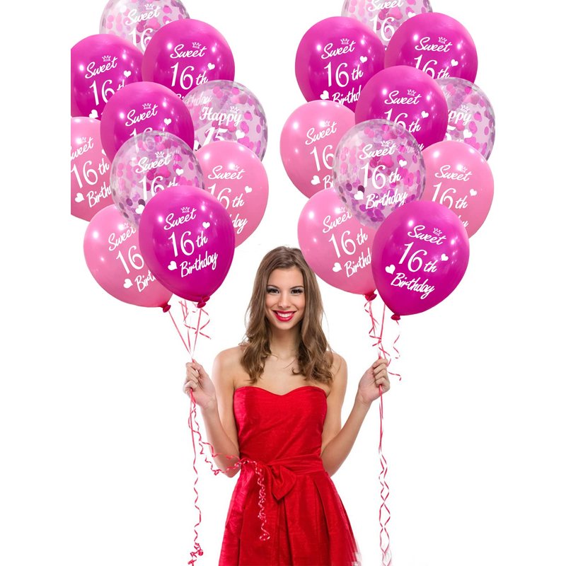 - Package Content:Sweet 16th birthday latex Balloons with 10 pieces 12 inch dark pink latex balloon printed "16th Happy Birthday",10 pieces 12 inch pink latex balloon printed "16th Happy Birthday",10 piece 12 inch hot pink confetti balloons. pink and hot pink confetti balloons will create a joyous atmosphere and leave unforgettable memories for you and your party guests.