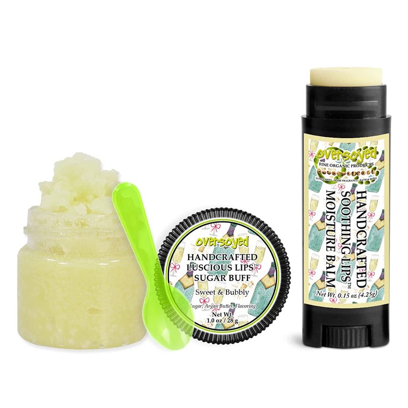 Sweet & Bubbly Soothing & Luscious Lips by OverSoyed Exfoliator & Chapped Lip Repair Lip Care Combo | Artisan Handcrafted to Order Champagne Fruity Herbal Vanilla Flavored Exfoliating Sugar Lip Scrub & Lip Moisturizer Balm Gift Set
