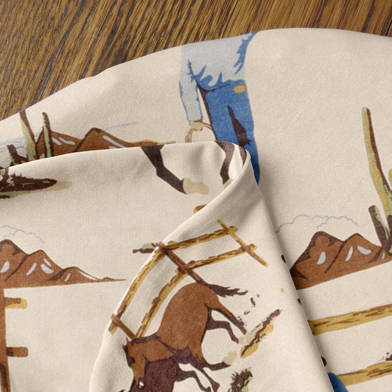 - 95% Rayon / 5% Spandex Jersey Stretch Knit featuring a multicolor western cowboys and horses
