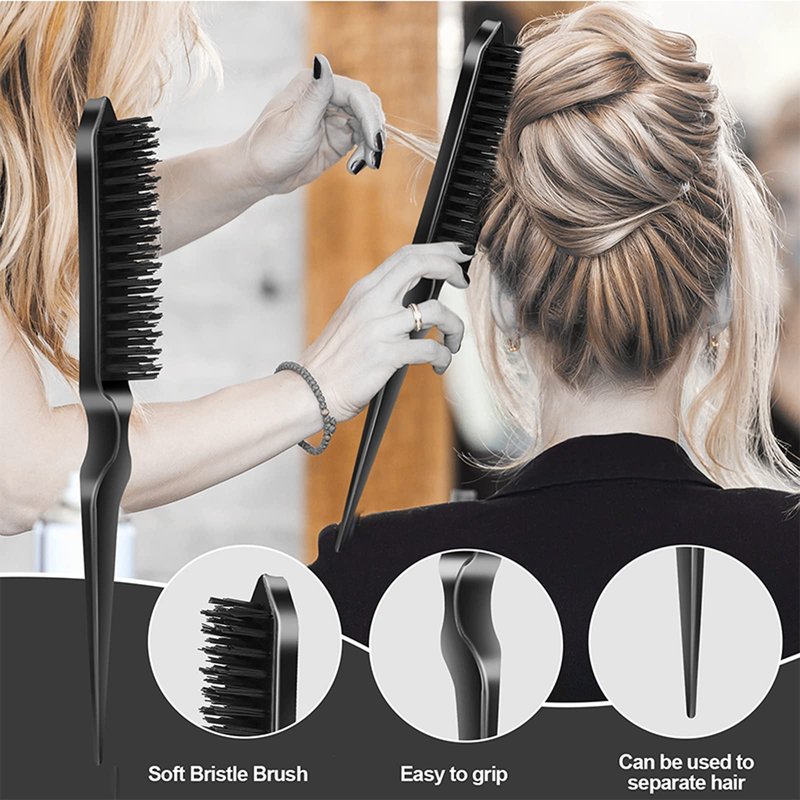 - Package: 1 Pcs Bristle Hair Brush, 1 Pcs Rat Tail Comb, 1Pcs Wide Tooth Comb, 1 Pcs Edge Brush Great for working with hair that is perfect for edge flyaway hair, baby hair, soft and fine hair