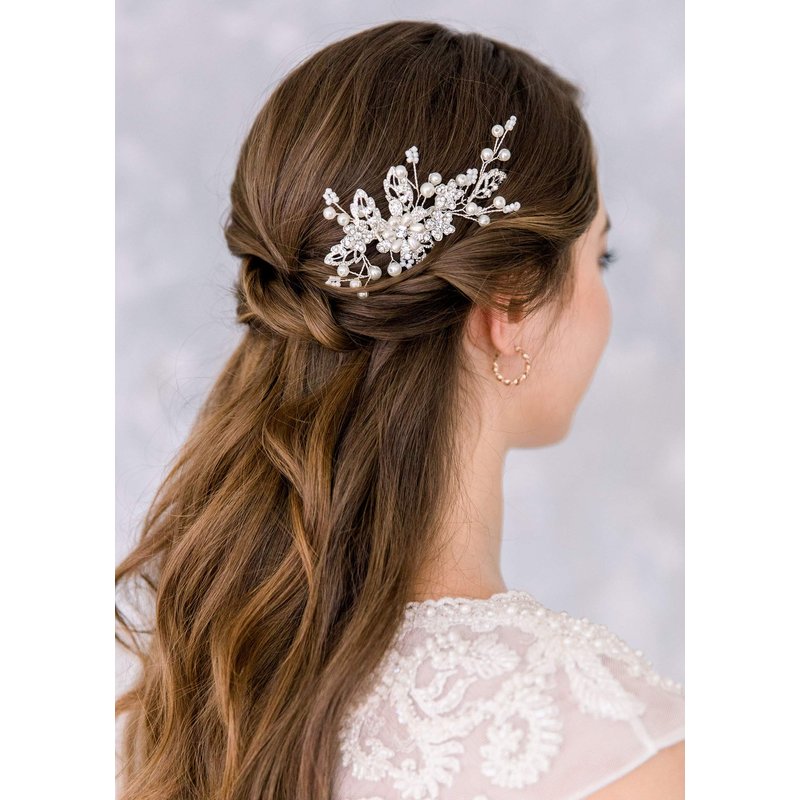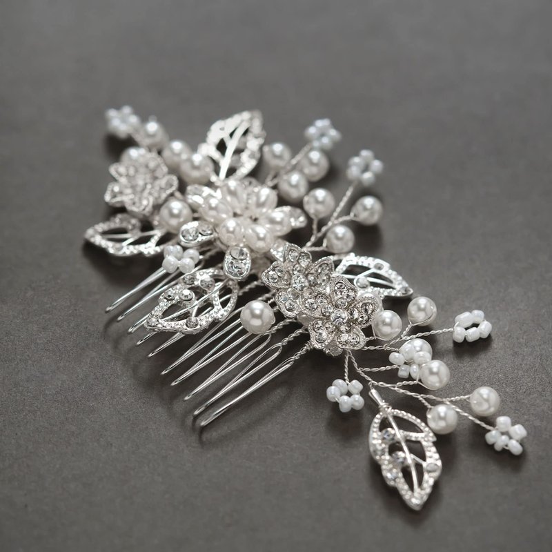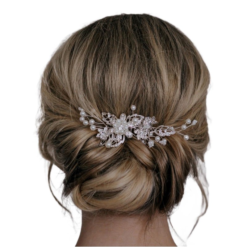 1.These rhinestones covered filigree patterns and floating pearls create a stunning bridal hair comb. This is a beautiful piece and will add the perfect touch to your wedding look.