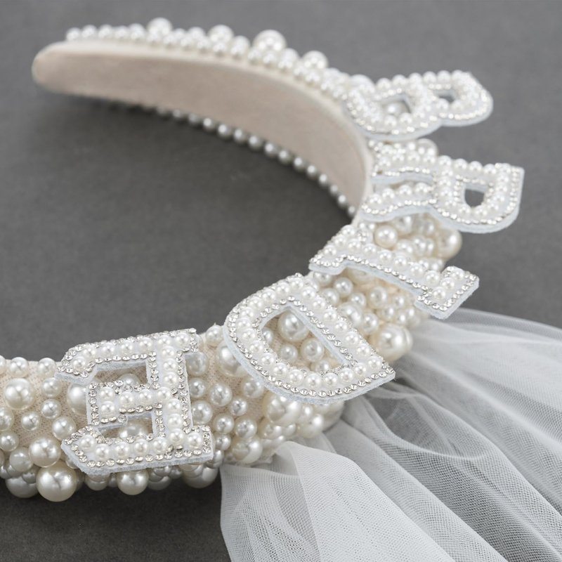 SWEETV Bride Headband with veil Bride to Be Headband Bachelorette Party Decorations Handmade Rhinestone Wedding Headband for Bridal Pearl Hair Accessories for Women Girls