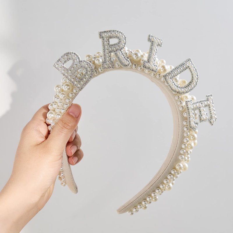 SWEETV Pearl Bride Headband Bachelorette Party Decorations Bride to Be Headband Handmade Rhinestone Bridal Headband for Wedding Pearl Hair Accessories for Women Girls