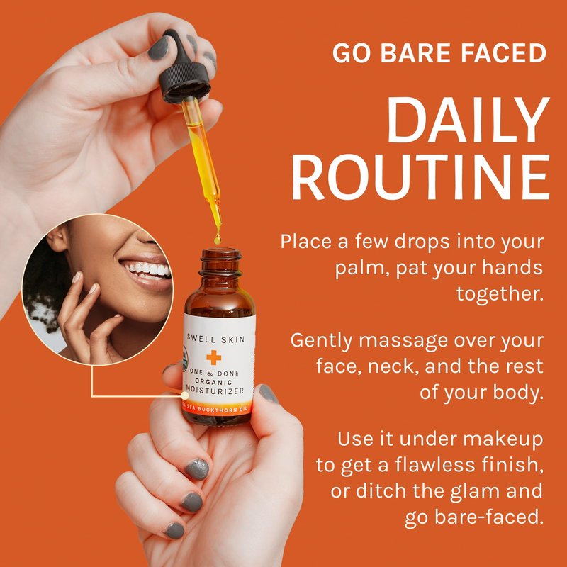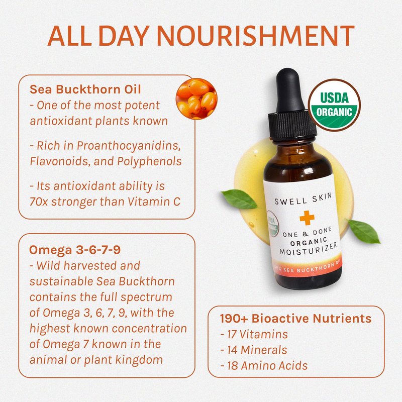 Let Your Skin Have It AllMake dewy skin with an airbrushed look your reality by moisturizing your face daily with SWELL SKIN. Busy people with no time for a complex routine that involves using a separate moisturizer & vitamin E serum will love SWELL SKIN. It owes its skin-loving benefits to the nutritive benefits of sea buckthorn oil, which is loaded with 4 fatty acids &190 bioactive compounds.