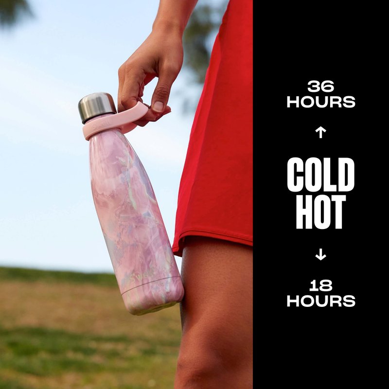 - TRIPLE-LAYERED INSULATION: S’well 17oz Bottle with stainless steel. Triple-layered, vacuum-insulated construction. Exclusive Therma-S’well Technology keeps beverages cold for 36 hours and hot for 18. Sleek and beautifully crafted. Hand-wash only.