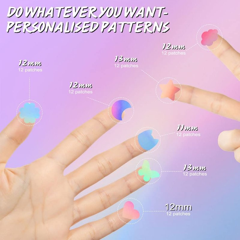 - 🦋 Variety Shapes & Sizes: Compared with other brands of pimple patches zit stickers, our offers you 7 shapes and 3 sizes: four leaf clover, butterfly, cat, moon, heart, star, cloud shape; 11mm, 12mm and 13mm, choose the best size and shape for your affected area(total 84 dots).