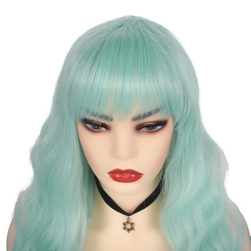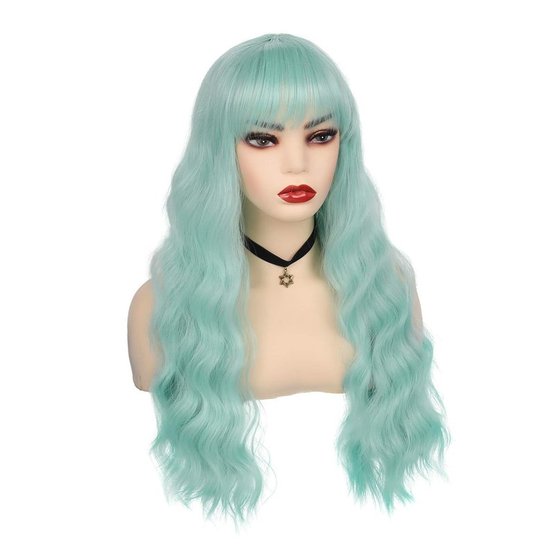 Swiking Mint Green Wigs for Women with Bangs Long Curly Wig Light Green Wig for Women Wavy Green Wig Heat Resistant Synthetic Hair Cosplay Costume Wig