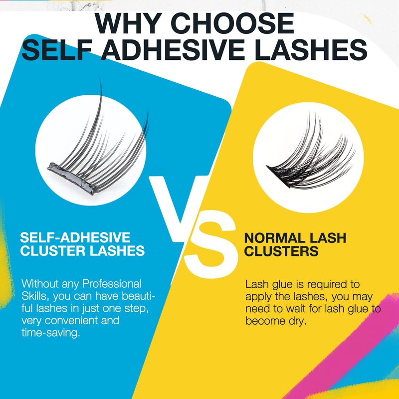 - 【1-Step Application】Only 1 step finish apply, saving more money. The self-adhesive cluster lashes are easy to wear, just press the lash clusters underneath your natural lashes, no need to buy lash glue. Eliminate the step of applying lash glue and waiting for the glue to dry, shortening your eye makeup time. You don't have to put up with lash glue sticking to your skin and ruining your makeup.
