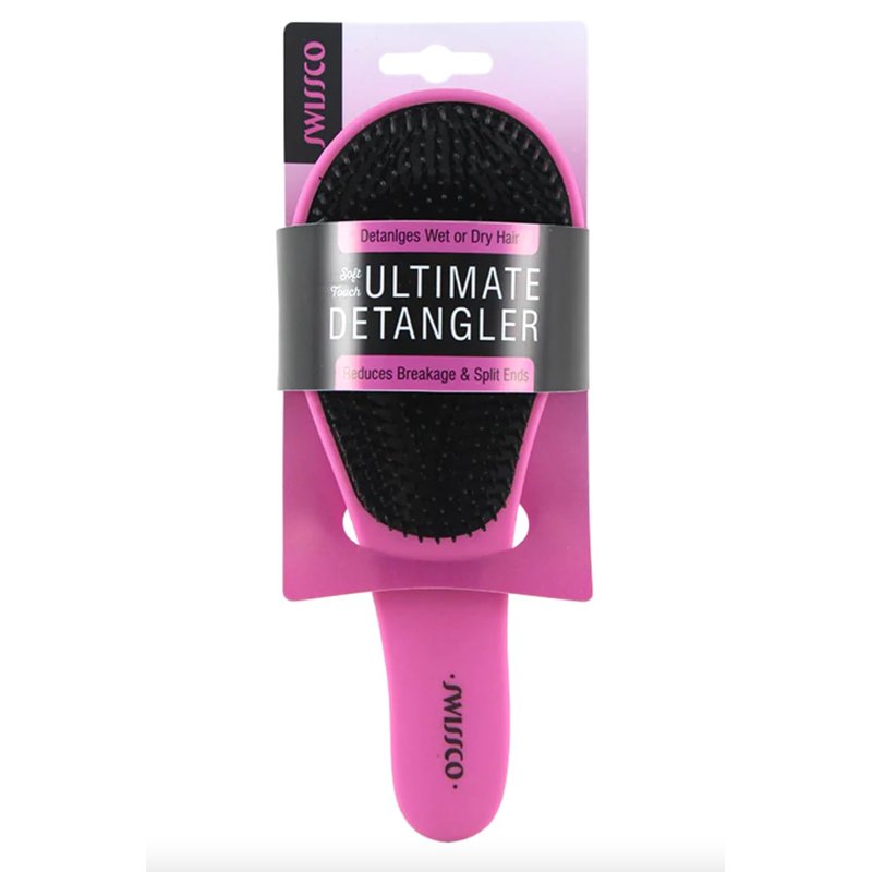 Product details: Swissco Swissco Pro Soft Touch Ultimate Detangler Detangling Hair Brush. This hair brush has unique flexible bristles that detangle for easy styling. No more tugging or pulling. Kid and mom approved. Use on wet or dry hair. Soft Touch handle finish for an easy hand grip. Recommended for all hair types included long, short, thick, thin, fine, curly, wavy, straight, dry, damaged, oily and color treated.