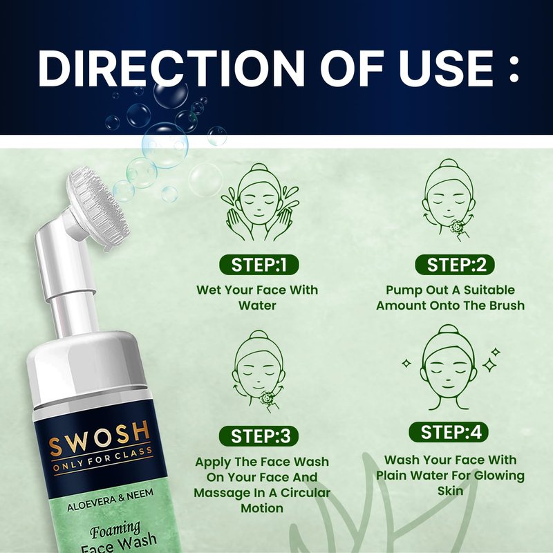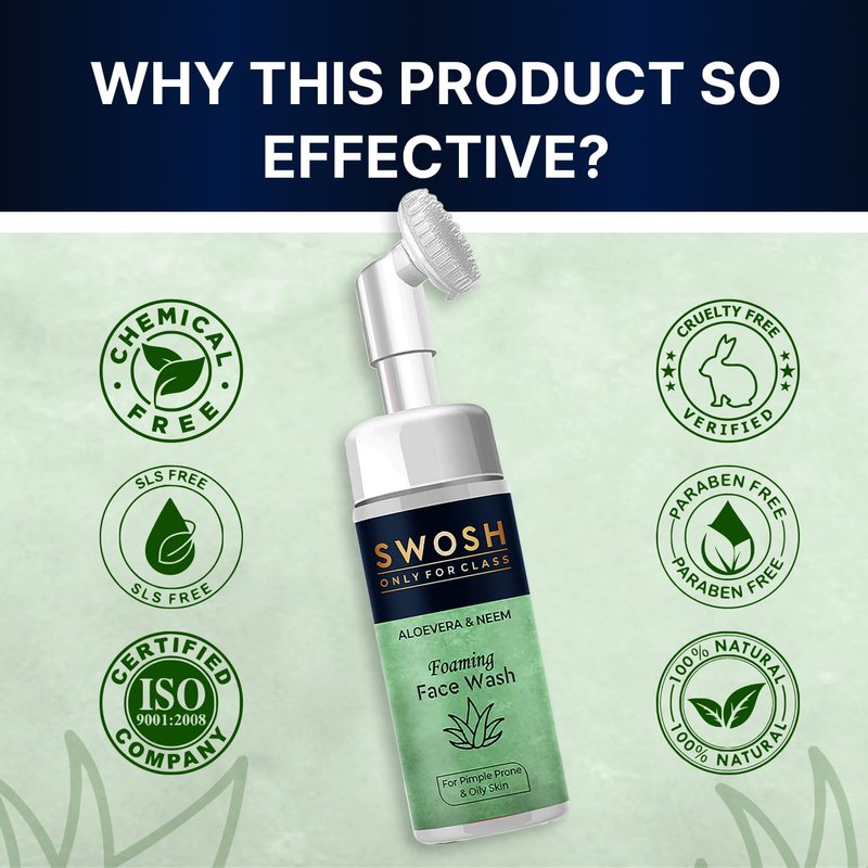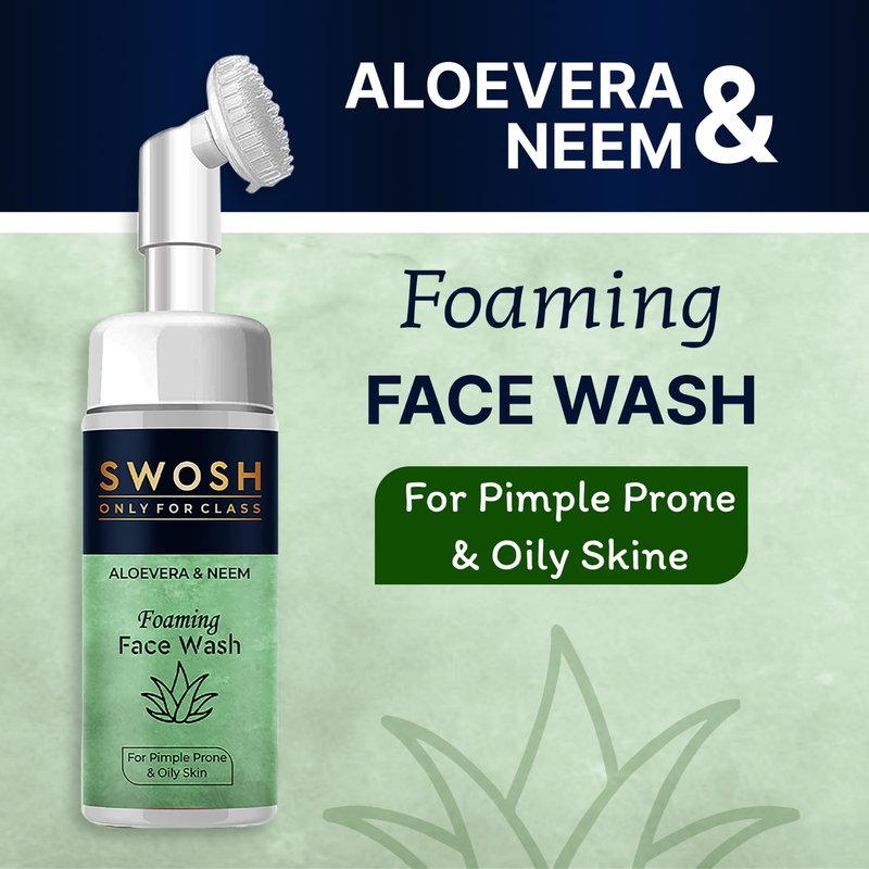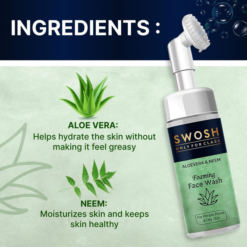 - The foaming face cleanser Swosh Aloe Vera and Neam comes with a soft silicone integrated facial brush that gently exfoliates your skin and eliminates the dead skin layer.