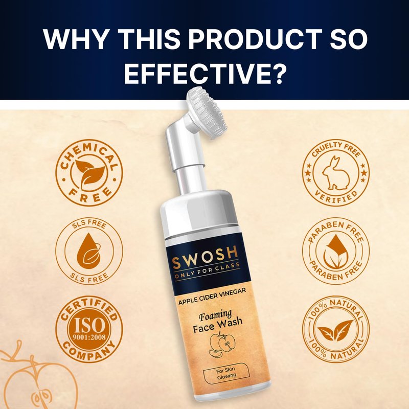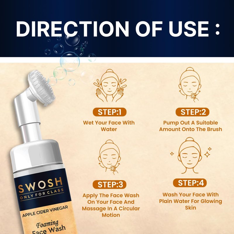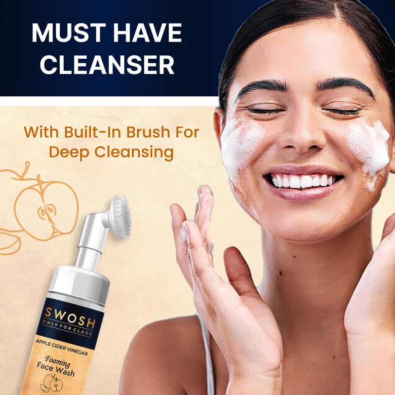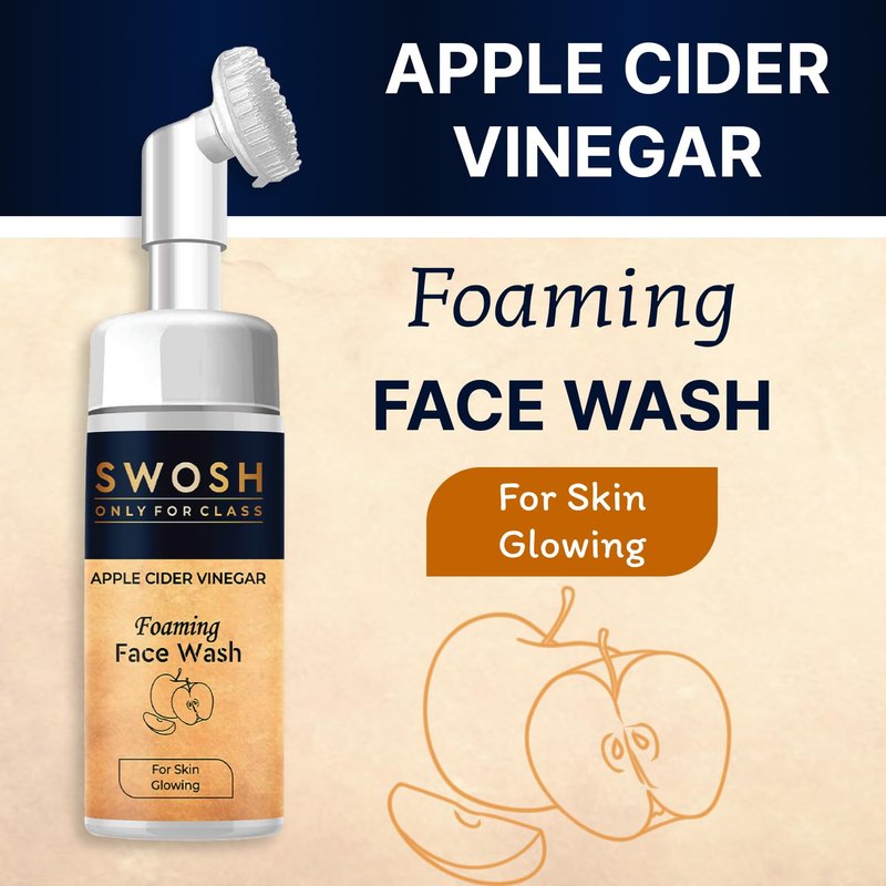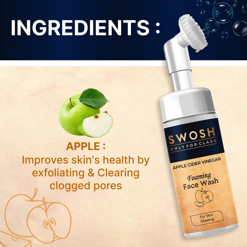 - The foaming face cleanser Swosh Apple Cider vinegar comes with a soft silicone integrated facial brush that gently exfoliates your skin and eliminates the dead skin layer.