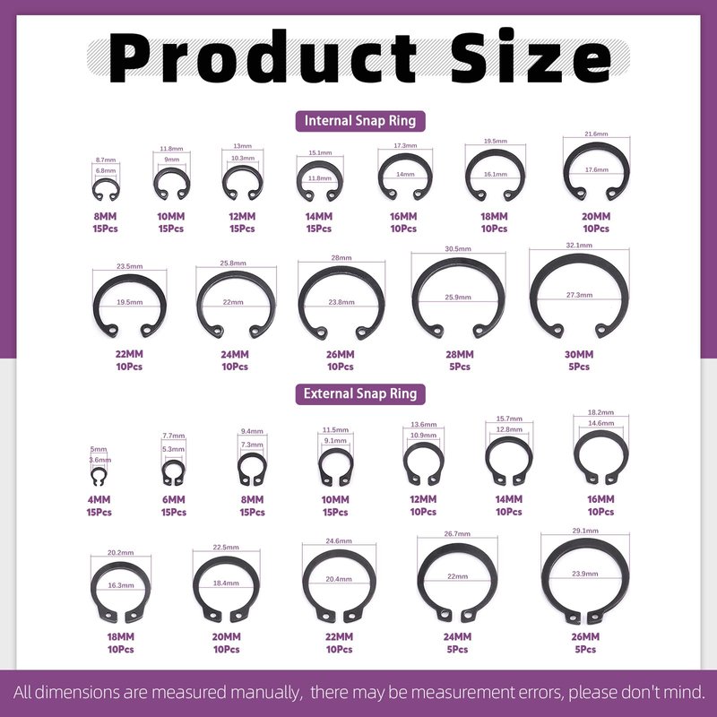 - π₯ Sizes Detail ------ Set Includes 16 Most-used Sizes (Metric): 4mm, 6mm, 8mm, 10mm, 12mm, 14mm, 16mm, 18mm, 20mm, 22mm, 24mm, 26mm, 28mm, 30mm, 28mm, 30mm. So many different sizes can definitely meet all your daily different needs. These snap rings Made of Alloy Steel, providing the good resisitance to corrosion and high temperature. The complete range of sizes are enough to meet your various needs in life.