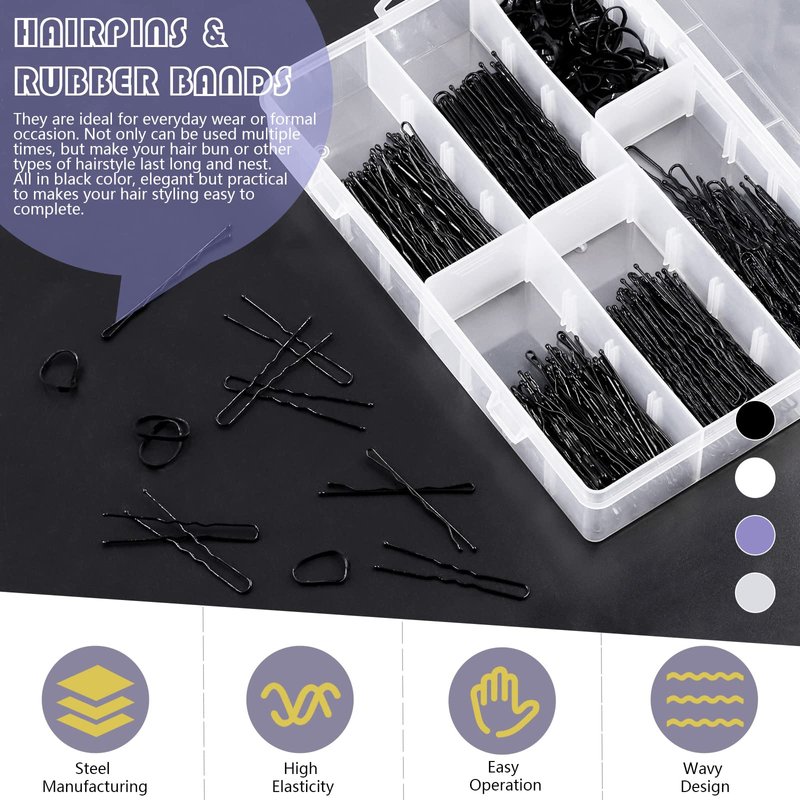 Swpeet 380Pcs 2 Styles 1.9Inch 2.4Inch 2.7Inch Black Hair Pins Bobby Pins with Rubber Bands Kit, Including 120Pcs Bobby Pins and 160Pcs U Hair Pins Hair Clips with Soft Elastic Bands for Girls and Women