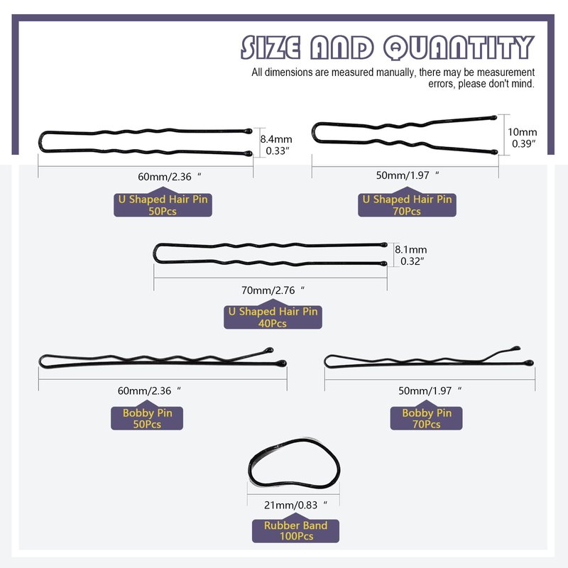 - ✿ HIGH QUALITY ---- You will get Including 120Pcs Bobby Pins and 160Pcs U Hair Pins Hair Clips with 100Pcs Soft Elastic Bands. Intotal 380Pcs. These hair pins are made of good quality metal and not easy to break; No easy to fade after applying for a long time. After a long period of use, there will be slight fading.This is normal. Please do not mind.