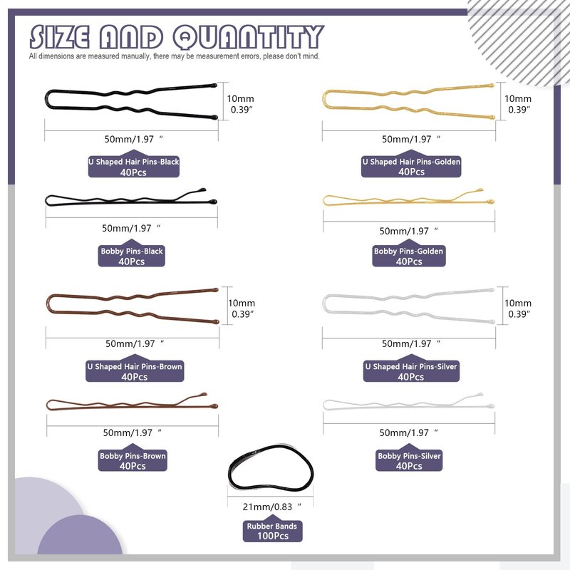 - ✿ HIGH QUALITY ---- You will get Including 160Pcs Bobby Pins and 160Pcs U Hair Pins Hair Clips with 100Pcs Soft Elastic Bands. Intotal 420Pcs. These hair pins are made of good quality metal and not easy to break; No easy to fade after applying for a long time. After a long period of use, there will be slight fading.This is normal. Please do not mind.