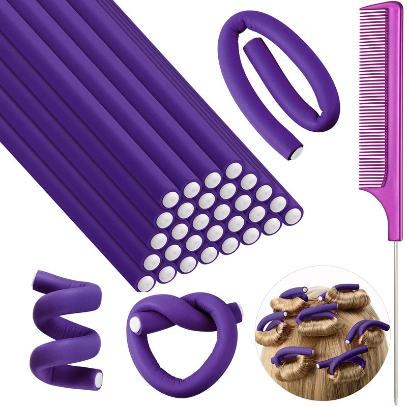Syhood 30 Pcs 7'' Flexible Curling Rods Twist Foam Hair Rollers Soft Foam No Heat Hair Rods Rollers and 1 Steel Pintail Comb Rat Tail Comb for Women Long Short Hair(Purple,7 x 0.3 Inch)