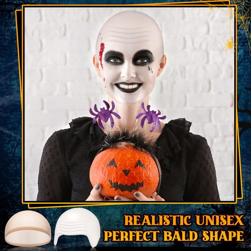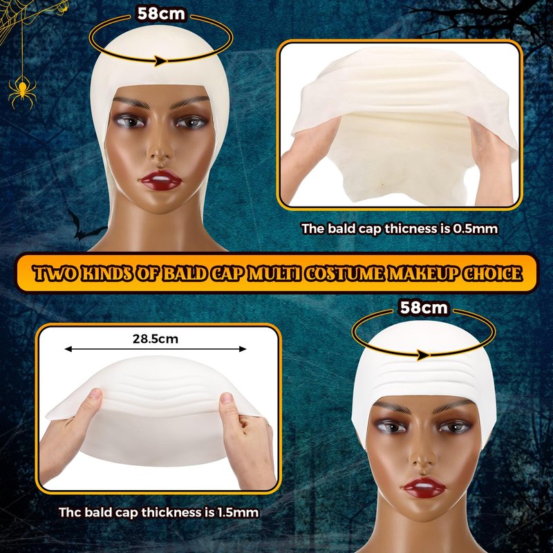 Bald caps makeup latex bald head wig cap bald hat makeup costume accessories for adults and kids, 4 piecesFeatures: Nice costume accessory: The bald caps are nice for children and adults to dress up as a bald guy. Whether it is for Halloween or a costume party, this cap will make your costume more realistic and draw a lot of attention. Specifications: Material: latexColor: as pictures shown Package contents: 1 x White wrinkled bald and 1 x white bald scalp2 x Wig capsNote: You can apply liquid latex to the edge of the cap and paste it on the skin, then use cosmetics to make it the same color as the skin for better results. Fix the existing hair with a wig before use.