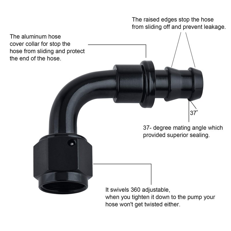 - Size : 10AN 90 Degree hose fitting; Push lock hose fitting made of lightweight 6061-T6 aluminum, black anodized surface has anti-corrosion effect.