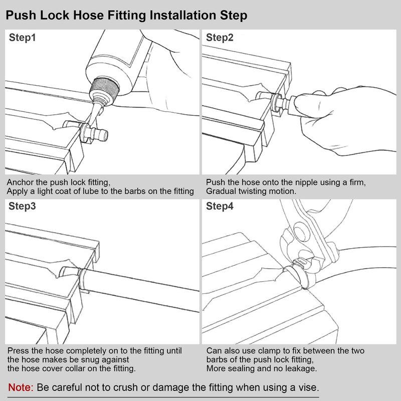 These fittings are only for use with a hose for push-on fittings. To ensure proper operation, the barbed end has to be pushed in all the way, with the hose end completely concealed by the ring. Push-lock fitting no installation instructions, Professional Installation is Highly Recommended.