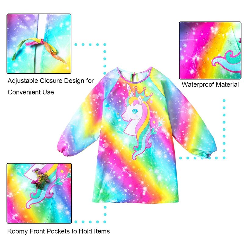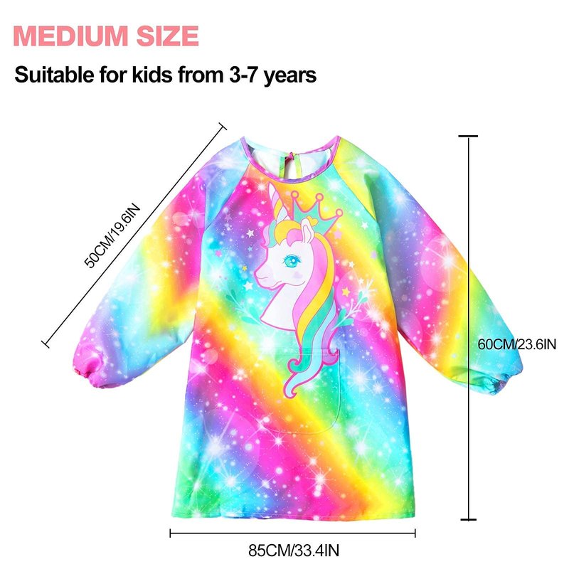 - 【SIZE REFERENCE】- Full sleeve rainbow unicorn apron smock have 2 sizes which is for 3-7 Years and 8-12 Years old to painting, cooking and other recreational activities. The great size of smock for kids is an all over protection and with the waterproof material you can rest easy that you little ones clothes will stay clean.